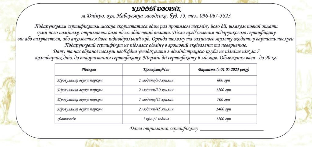 Кінний клуб «Кінний Дворик» у Дніпрі — це місце, де поєднуються спорт, любов до коней і відпочинок серед природи. У клубі 7 коней і 3 поні, що приносять радість дітям і дорослим. Тренування проводять досвідчені тренери, а вихованці клубу здобувають призи на змаганнях. «Кінний Дворик» — це про майстерність, емоції та гармонію з природою.